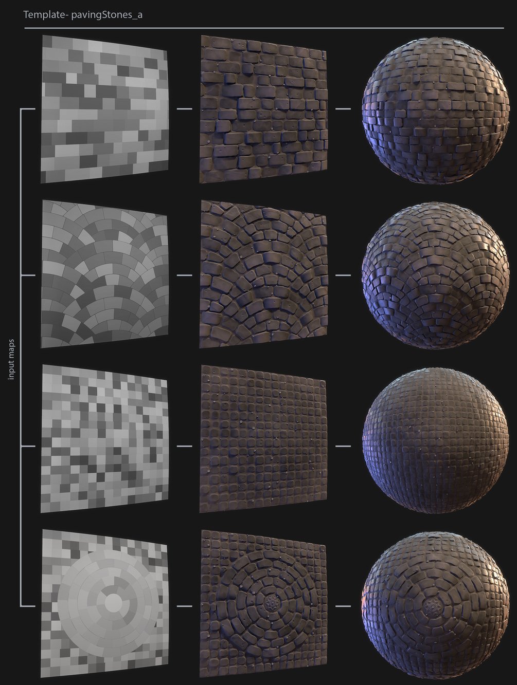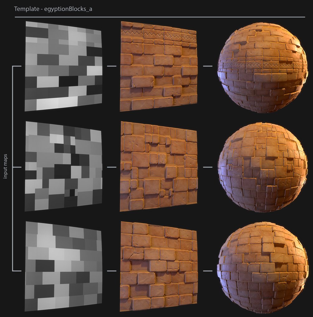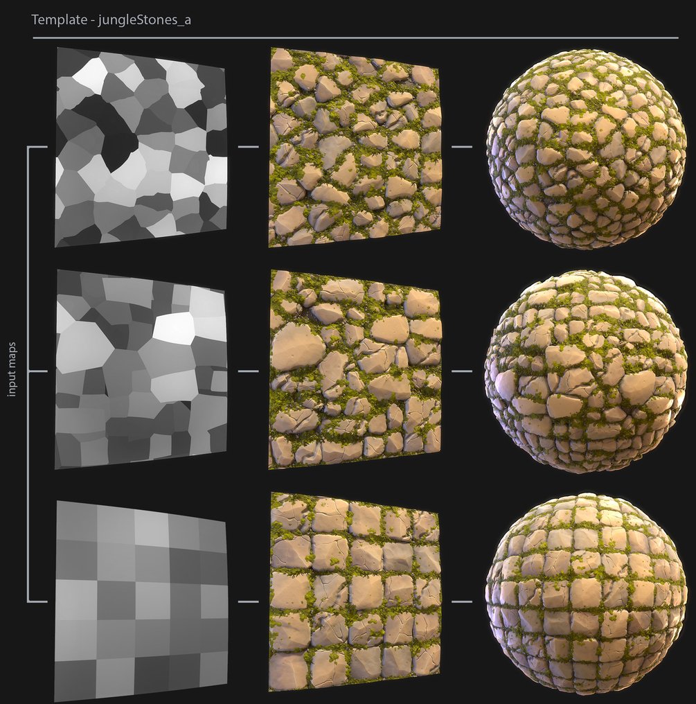 A Substance Designer network that creates unique and detailed stylized tiles from a basic grey-scale input map. It can do everything from simple, regular bricks or floor tiles, to complicated mossy stones or trim sheets. Included with the basic generator are also 7 pre-made templates to help get you started, as well as a fully notated interface with tool-tips for every feature. You can find the full list of features on the usage guide located here: jeffhoral.com/StylizedTileGen/usage_guide.html